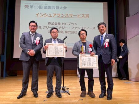 当日は協会 森上理事長とインシュアランスサービス 星野部長より授与