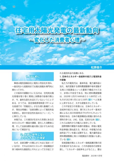 2025年11月1日発行の月刊電設資材11月号に、中部エリア会員 ㈱松原電機 松原俊介氏寄稿による 「住宅太陽光発電の最新動向~変化した消費者心理~」が掲載されました